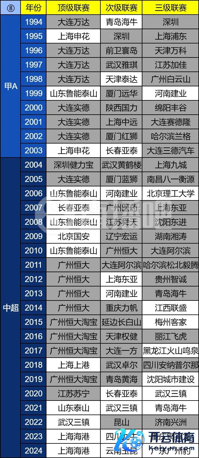广州队的解体仅仅中国足球艰难糊口环境的一个缩影。1994年,中国足球启动走向做事化,距今已有31年的历史。在这31年的手艺长河里,中国三级做事联赛(顶级联赛、次级联赛、三级联赛)一共产生了93次冠军。