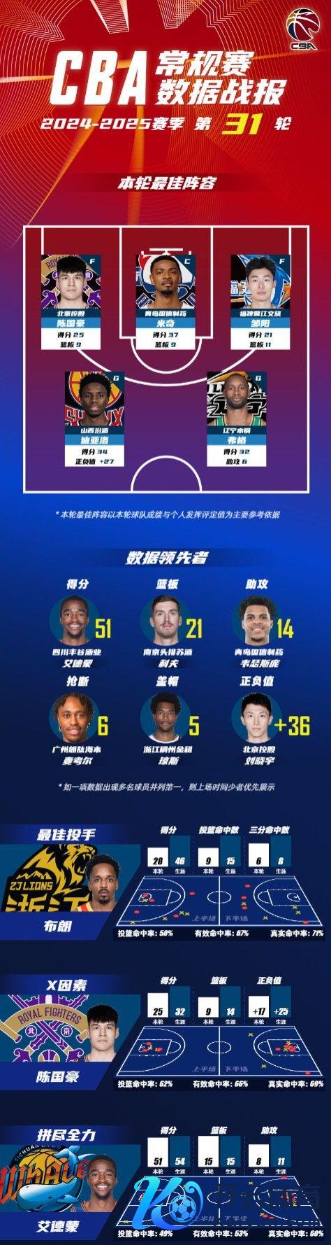 浙江外助布朗在本轮比赛射中6记三分,成为本轮的最好投手;陈国豪在北京德比比赛中拿到25分,刷新个东谈主赛季新高,当选本轮的X身分;四川队外助萨姆纳当选本轮的“拼尽全力”球员。