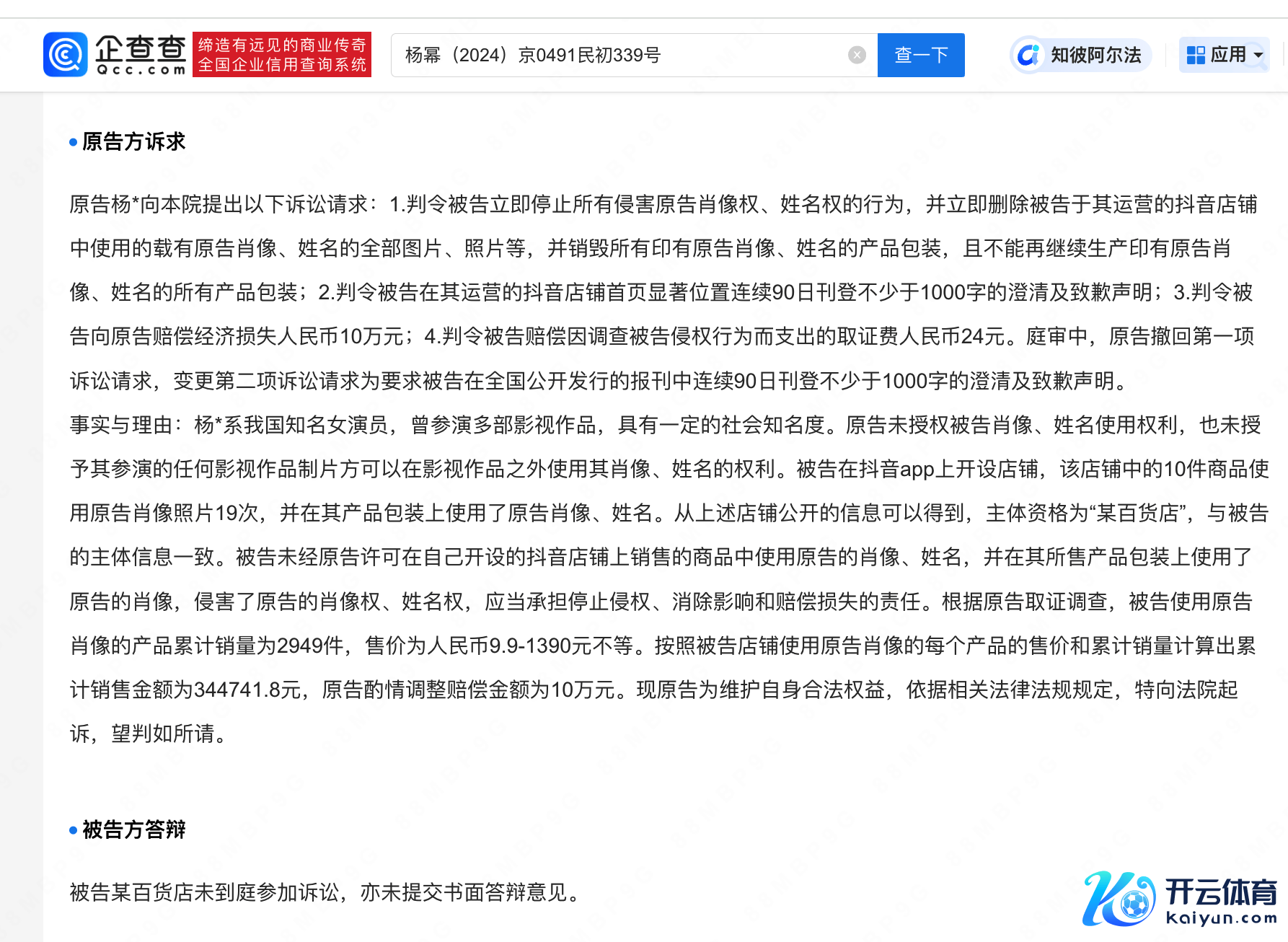 此前判决书清晰,杨幂诉求称被告在某平台开设店铺,10件商品使用原告肖像相片19次,并在其居品包装上使用了杨幂肖像、姓名,法院判决被告公开赔礼谈歉并抵偿经济蚀本1.5万元。