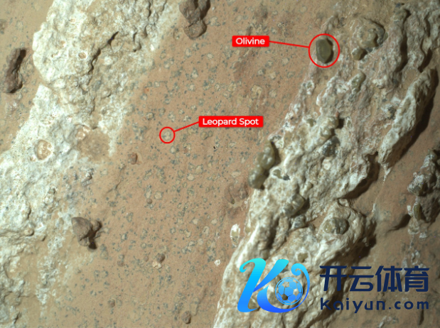 ▲这张由NASA意识号火星车WATSON成像仪拍摄的相片,聚焦于「切亚瓦瀑布」(Cheyava Falls)岩石样本的名义细节。图像展示了一个鄙俚、多孔的淡色岩层,布满微细颗粒和雀斑,红色箭头标注了两个重要特征:上方是一个卵形深色颗粒,标注为Olivine(橄榄石,一种常见的火成岩矿物,常源于火山活动);下方是一个较小的白色圆点,标注为「Leopard Spot」(豹斑,指毫米级铁磷酸盐和硫化物矿物雀斑,可动力于氧化归附反应,与潜在微生物活动磋议)。这些雀斑镶嵌在泥质基质中,全体颜色从米黄到浅灰,名义散布着微小凹坑和碎片,示意陈腐湖泊千里积环境。图片强调了岩石的化学各样性,为天体生物学参议提供视觉思绪。图片起原:NASA/JPL-Caltech/MSSS。