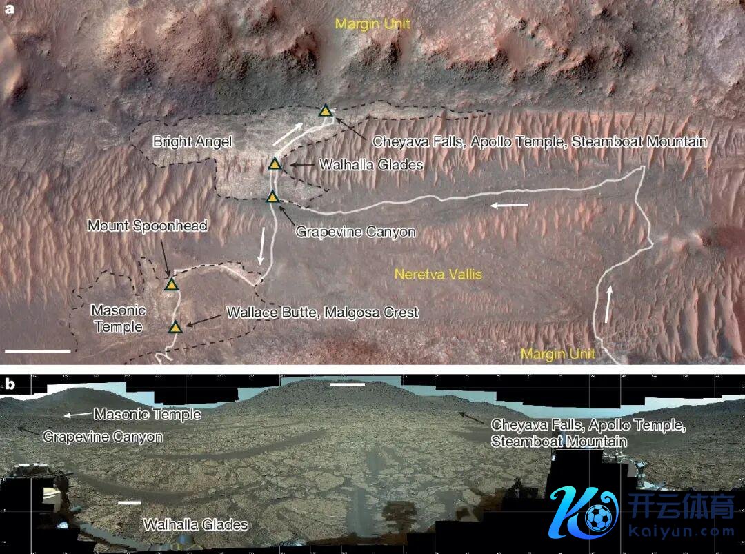 ▲这张来自《当然》杂志论文的配图,描写了NASA意识号火星车在杰泽罗陨石坑的探索踪影,焦点是「亮堂天神」(Bright Angel)地层——一个潜在贮蓄旷古生命思绪的淡色露头。a部分是轨说念俯瞰图,白色线条重复显现探伤器的穿越旅途,从旯旮单位(Margin Unit,一种碳酸盐岩层)肇始,沿内雷特瓦河谷(Neretva Vallis,一条陈腐河说念)曲折前行,路过多个地质秀美如「切亚瓦瀑布」(Cheyava Falls)、「瓦尔哈拉冰川」(Walhalla Glades)和「葡萄藤峡谷」(Grapevine Canyon),最终抵达马索尼克神庙(Masonic Temple)露头;橙色三角标注了科学不雅测点,箭头指令主义,提供约100米门径视角。b部分则是探伤器Mastcam-Z相机拍摄的增强彩色全景拼接图,从约110米辽远瞭望「亮堂天神」地层的前程与上方高耸的旯旮单位战役面,地平线上点缀着「切亚瓦瀑布」「阿波罗神庙」(Apollo Temple)和「轮船山」(Steamboat Mountain)等景不雅,门径条标注50厘米和100米。全体图示强调了氧化归附运行的矿物和有机关联,让读者如亲临火星郊外,感受这时势质探险的飘荡。图片起原:NASA/JPL-Caltech/ASU/MSSS。