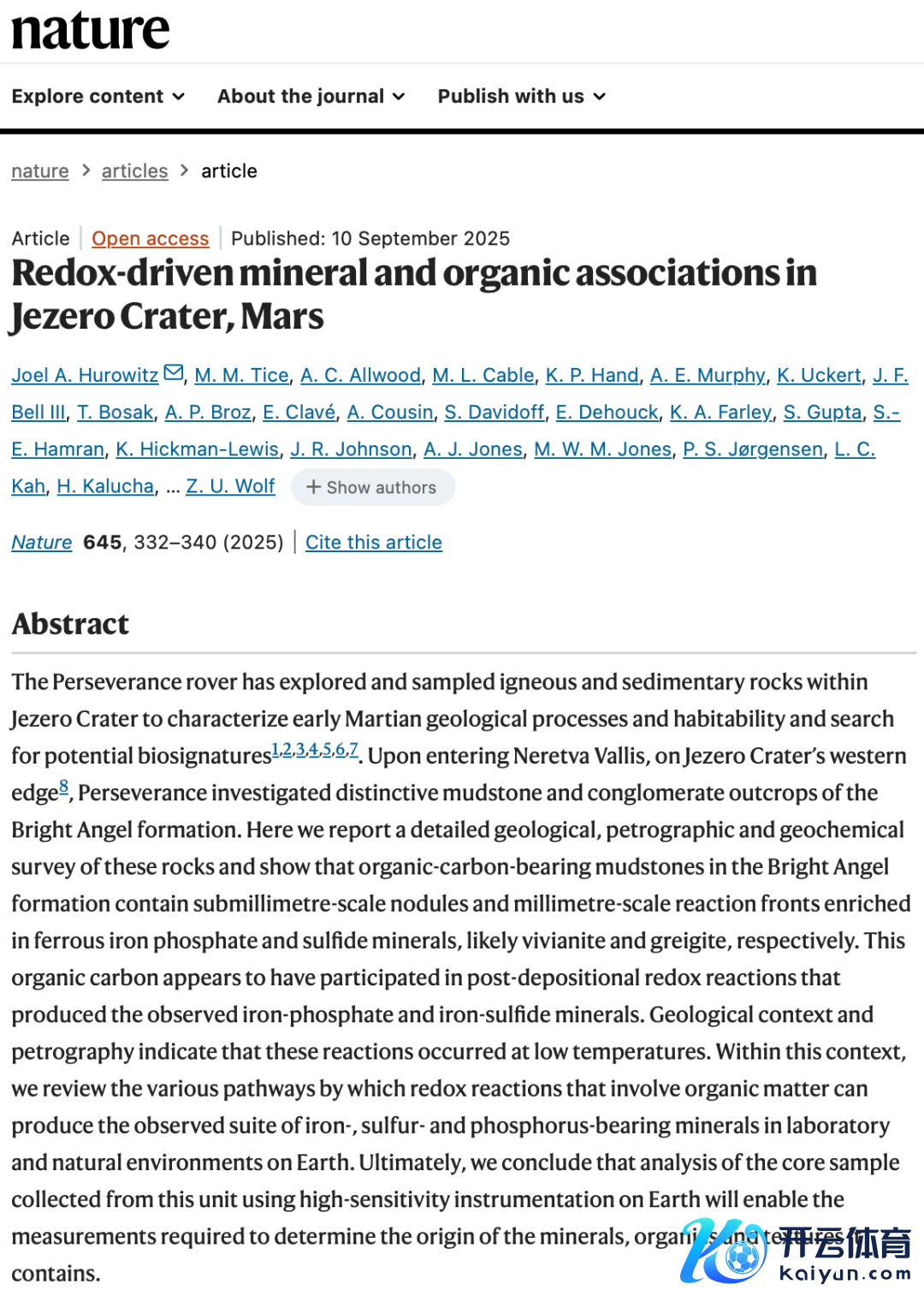 就在昨天,2025年9月10日,伦敦帝国理工学院带领的海外参议团队在巨擘期刊《当然》(Nature)杂志上重磅发布论文,晓示NASA意识号火星车在红色星球上发现迄今最具劝服力的潜在旷古生命根据!一块名为「切亚瓦瀑布」(Cheyava Falls)的岩石样本开云(中国)Kaiyun·体育官方网站-登录入口,布满玄妙的毫米级豹斑岩(leopard spots),这些雀斑富含铁磷酸盐和铁硫化物矿物,陪同有机碳的存在,仿佛是微生物代谢的「化石指纹」。这一发现一会儿点火大师科学界神态:火星曾是生命摇篮的猜念念,从科幻走向试验?但科学家们安靖指示,可信讲明需将样本带回地球——这不仅是时间挑战,更是东说念主类探索天下并立的调动点。让咱们奴隶这块岩石的思绪,揭开火星旷古湖泊的玄妙。