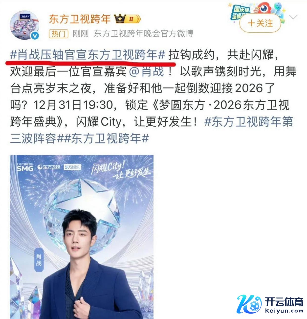 东方卫视压轴官宣肖战过问跨年盛典,网传三首连唱引爆期待值!肖战四肢东方卫视2026跨年盛典惟一压轴官宣嘉宾开云(中国)Kaiyun·体育官方网站-登录入口,因突破平台前三轮字母排序常规、得回专属定制宣推排面激发全网热议!肖战本年能否过问跨年行径,在哪个平台过问王人是网友一直以来非常怜惜的问题!这不东方卫视带着压轴词条在已官宣了三波威望之后,肖战被单独安排在最终门径官宣。