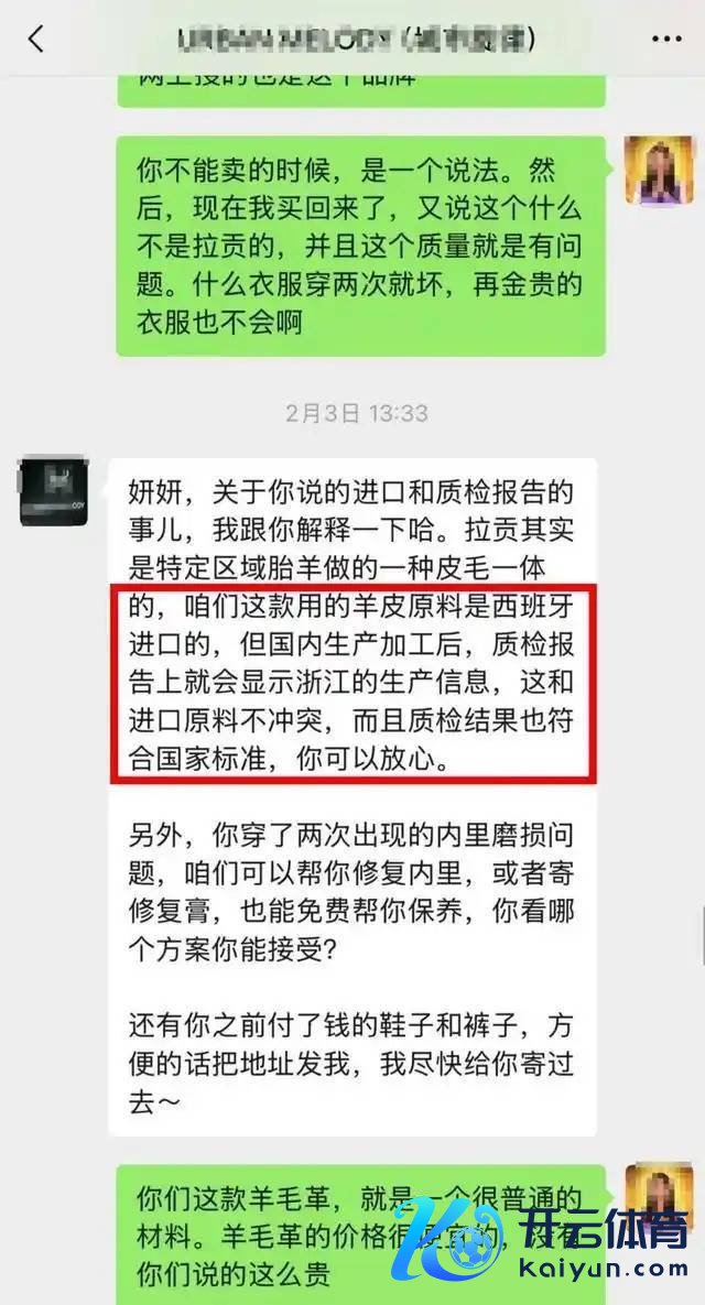 店雇主回话称我方在销售经由中从未答应过该皮草系“西班牙入口拉贡”,并向记者科普了所谓“拉贡”仅仅一个外相一体的名称。但冷女士很快便拿出了笔据,该店客服在与冷女士的聊天记载中提到该皮草的原材料是“西班牙入口”。雇主停顿几秒后回复谈:有这个东西就去送检,为什么干预我正常贸易?