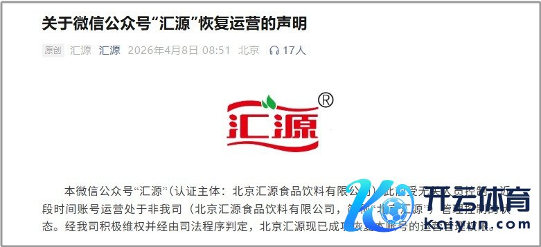 凭据北京汇源发布的声明,微信公众号“汇源”(认证主体为北京汇源食物饮料有限公司)在此前一段时安分“受无关东说念主员适度”,运营状况脱离公司管控。其中,该账号在2025年8月至2026年1月间发布的六次内容均非官方言论,不代表公司实在态度,公司亦不承担商酌法律拖累。