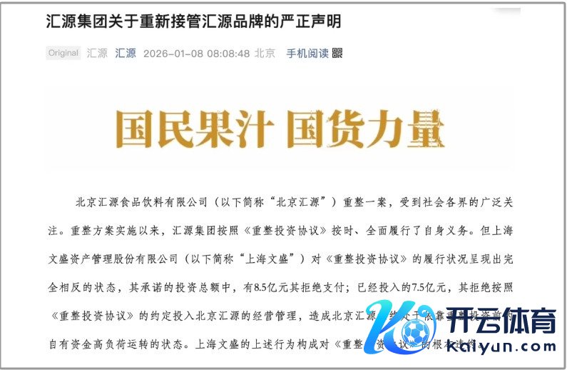 同期,汇源集团称,“窃据”北京汇源的上海文盛不具备任何坐褥果汁的辅导,采购未经汇源集团质料体系监督的果汁原料进行坐褥,推行是坐褥“冒名顶替”居品。因此,集团决定全面继承北京汇源,待上海文盛全面履行《重整投资合同》并经北京市第一中级东说念主民法院阐述后,汇源集团将把料理权交还届时新任的北京汇源料理层。